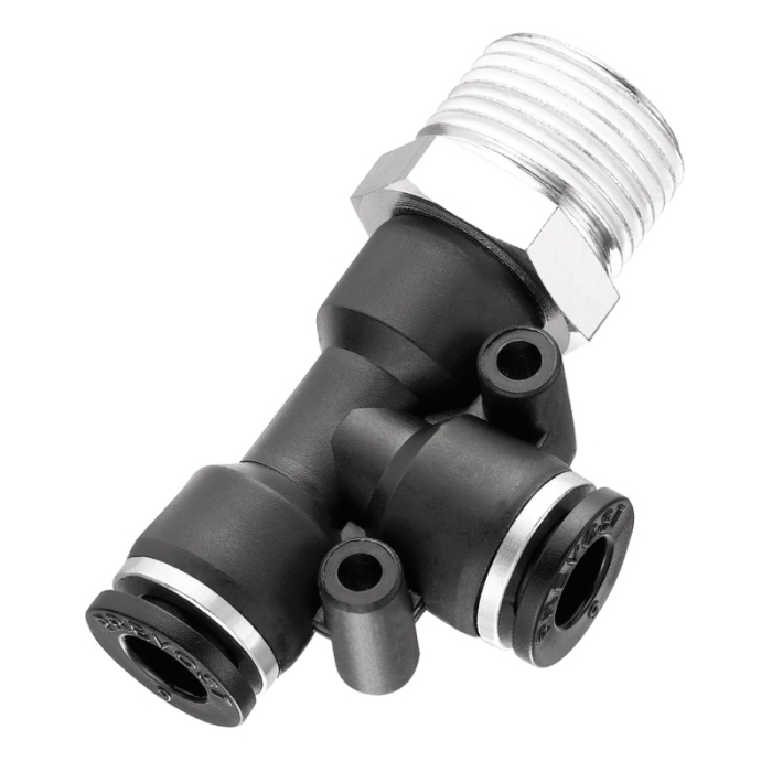 Prevost® Run Tee, Series: RPT AR, Connection Type 1: Push-to-Connect, Connection Size 1: 3/8 in, Connection Type 2: Push-to-Connect, Connection Size 2: 3/8 in, Connection Type 3: NPT, Gender 3: Male, Connection Size 3: 3/8 in, 0 - 145 psi, Material Construction: Brass/Polymer, Finish: Nickel-Plated, Dimensions: 2.52 in L, 32 - 140 deg F, For Use With: 3/8 in OD Tubing