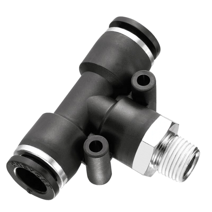 Prevost® Branch Tee, Series: RPT CR, Connection Type 1: Push-to-Connect, Connection Size 1: 1/4 in, Connection Type 2: Push-to-Connect, Connection Size 2: 1/4 in, Connection Type 3: NPT, Gender 3: Male, Connection Size 3: 1/4 in, 0 - 145 psi, Material Construction: Brass/Polymer, Finish: Nickel-Plated, 32 - 140 deg F, For Use With: 1/4 in OD Tubing