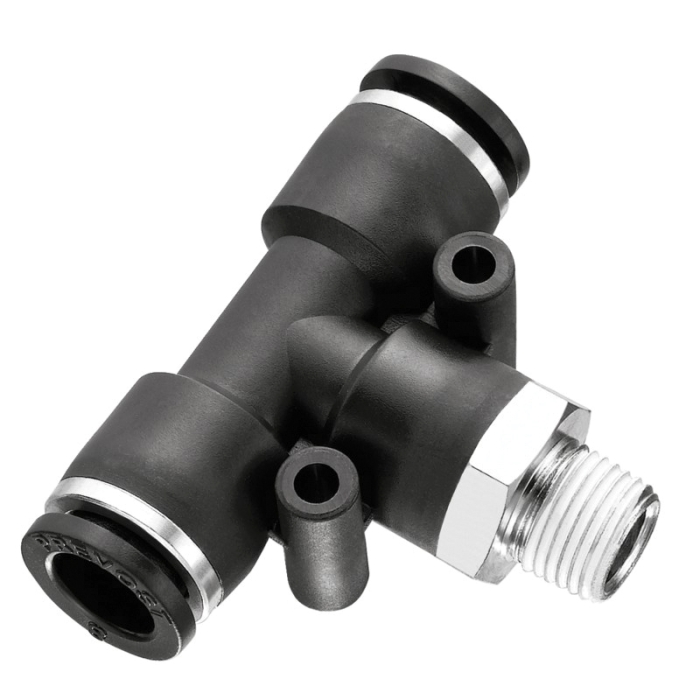 Prevost® Branch Tee, Series: RPT CR, Connection Type 1: Push-to-Connect, Connection Size 1: 3/8 in, Connection Type 2: Push-to-Connect, Connection Size 2: 3/8 in, Connection Type 3: NPT, Gender 3: Male, Connection Size 3: 3/8 in, 0 - 145 psi, Material Construction: Brass/Polymer, Finish: Nickel-Plated, 32 - 140 deg F, For Use With: 3/8 in OD Tubing
