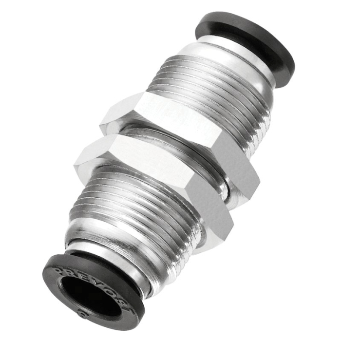 Prevost® Bulkhead Union, Series: RPU TT, Connection Type 1: Push-to-Connect, Connection Size 1: 3/8 in, Connection Type 2: Push-to-Connect, Connection Size 2: 3/8 in, 0 - 145 psi, Material Construction: Brass/Polymer, Finish: Nickel-Plated, Dimensions: 1.598 in L, 32 - 140 deg F, For Use With: 3/8 in OD Tubing