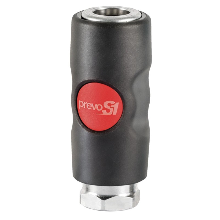 Prevost® Industrial Non-Scratch Coupler, Series: USI, Connection Type 1: Quick Disconnect, Connection Size 1: 3/8 in, Connection Type 2: NPT, Gender 2: Female, Connection Size 2: 3/8 in, 29 - 174 psi, Material Construction: Composite, Dimensions: 1.299 in Dia x 3.244 in L, Dimension Standards: ISO 4414, 5 - 158 deg F