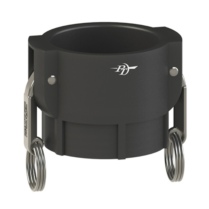 PT Coupling Cam and Groove Coupler, Connection Type 1: Type D, Gender 1: Female, Connection Size 1: 2 in, Connection Type 2: NPT, Gender 2: Female, Connection Size 2: 2 in, 100 psi, Material Construction: Polypropylene, Black, Dimensions: 3.94 in OD x 3.1 in L, -15 deg F