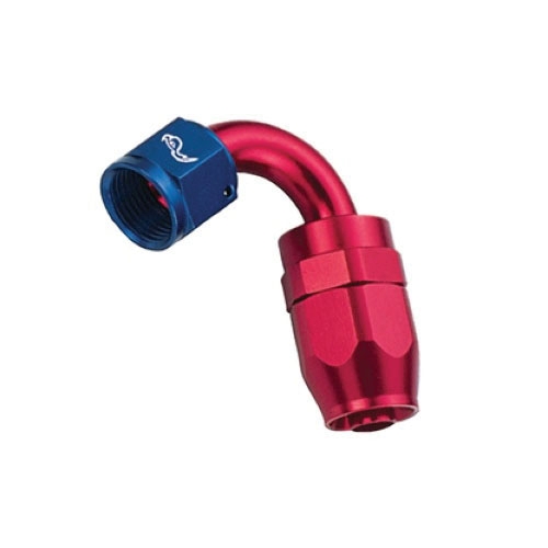 Roadrunner Full Flow 120 deg Hose Fitting, Connection Type 1: Hose, Connection Size 1: 5/8 in, Connection Type 2: JIC Swivel, Gender 2: Female, Connection Size 2: 5/8 in, Material Construction: 6061-T651 Heat Treated Aluminum, Blue/Red