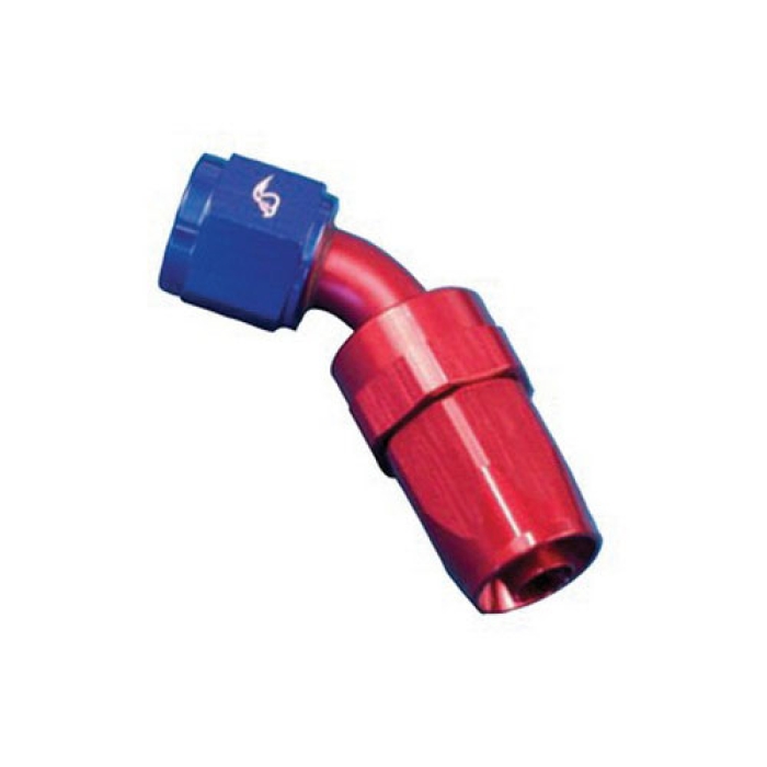 Roadrunner High-Performance Full Flow 45 deg Hose Fitting, Connection Type 1: Hose, Connection Size 1: 1 in, Connection Type 2: JIC Swivel, Gender 2: Female, Connection Size 2: 1 in, Material Construction: Aluminum, Finish: Blue/Red
