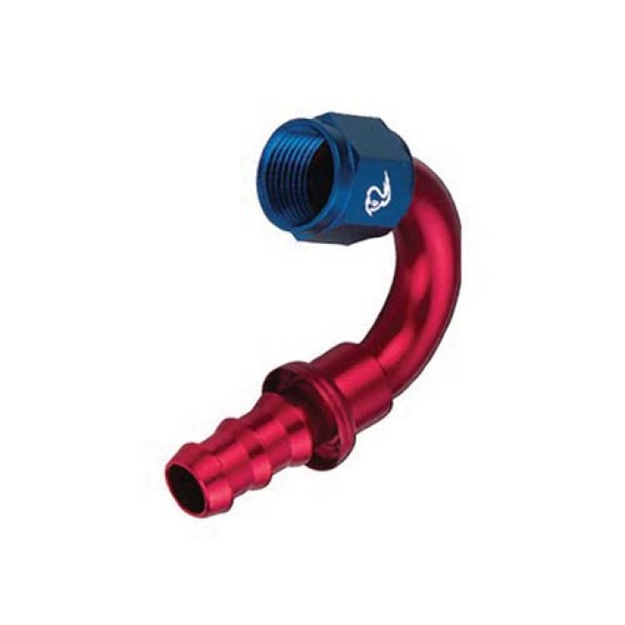 Roadrunner 150 deg Hose Fitting, Connection Type 1: Hose, Connection Size 1: 1/4 in, Connection Type 2: Push-On, Connection Size 2: 1/4 in, Material Construction: Aluminum, Finish: Anodized, Blue/Red