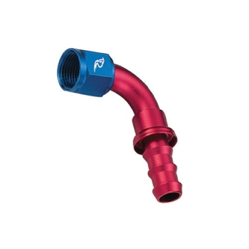 Roadrunner High-Performance 90 deg Hose Fitting, Connection Type 1: Hose, Connection Size 1: 1/2 in, Connection Type 2: Push-On, Connection Size 2: 1/2 in, Material Construction: High-Grade Aluminum, Finish: Anodized, Blue/Red