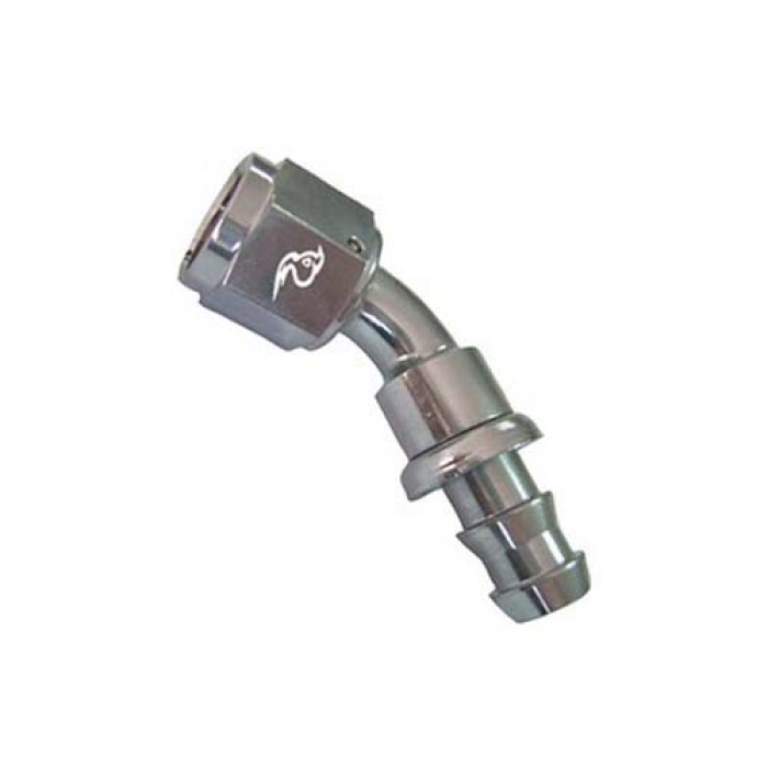 Roadrunner 45 deg Hose Fitting, Connection Type 1: Hose, Connection Size 1: 3/4 in, Connection Type 2: Push-On, Connection Size 2: 3/4 in, Material Construction: 6061-T651 Aluminum, Finish: Nickel-Plated
