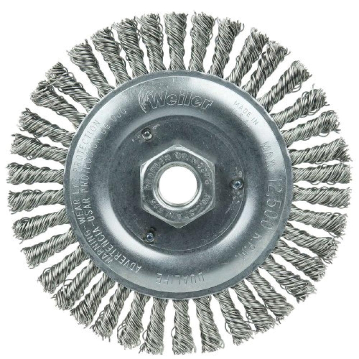 ROUGHNECK® JR. Weld Cleaning Brush, 5 in Brush Diameter, 5/8-11 Arbor, 7/8 in Trim Length, 3/16 in Face Width, 0.02 in Bristle Diameter, Stringer Bead Knotted Bristle, Stainless Steel Bristle, 12500 rpm Maximum Speed, Applicable Materials: Stainless Steel, Steel, Nut, Threaded Arbor Hole Mounting, Performance Tier: Max, Silver