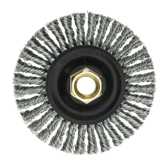 ROUGHNECK® MAX 13138 Weld Cleaning Brush, 4 in Dia Brush, Stringer Bead Knotted Bristle, 5/8 in Arbor, 7/8 in L Trim