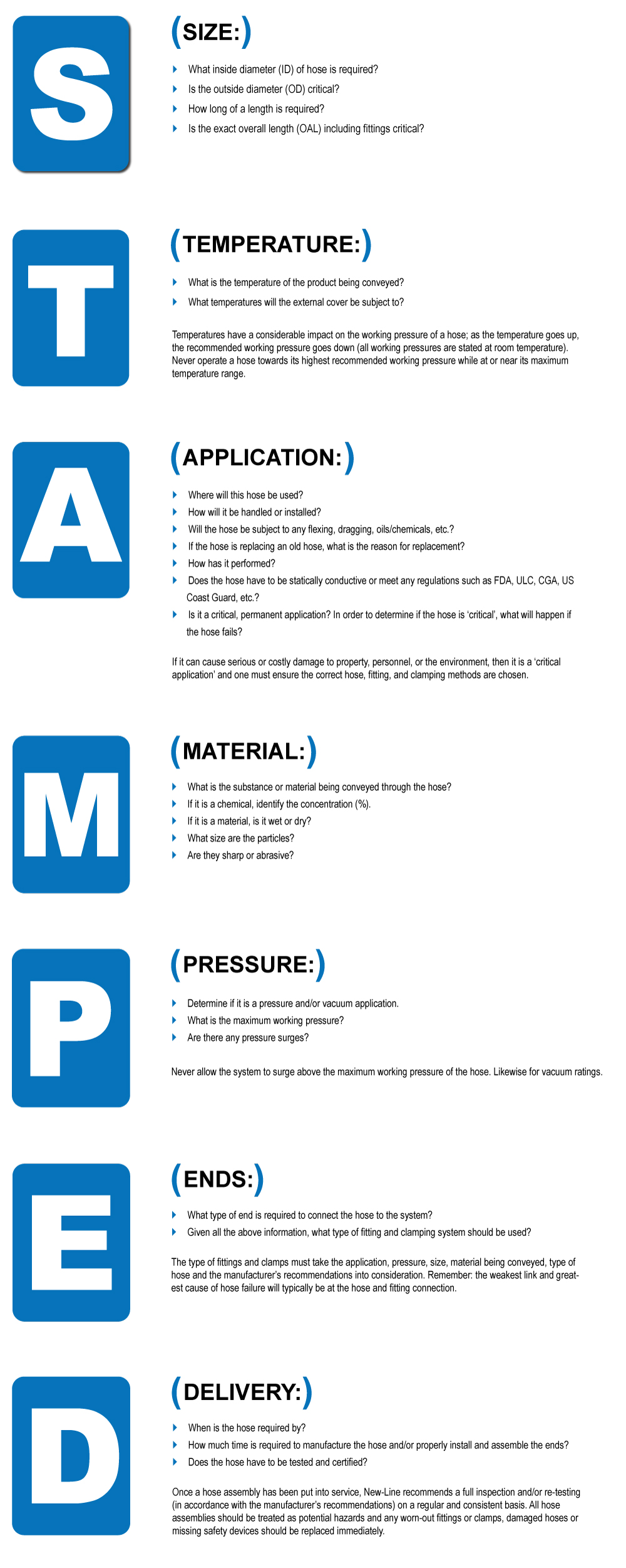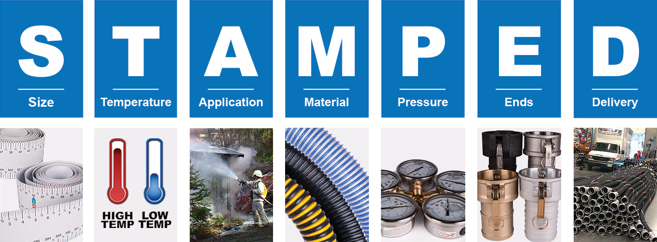 The acronym “STAMPED” will help in the proper selection of hose and/or fittings to reduce the chance of a failure from a misapplication. Serious damage and/or injury may occur if a hose or fitting is used in an application other than what it is designed for. It must also be noted that hose will degrade over time and is not designed for permanent piping applications, especially when it will not be subject to routine testing and inspection. These simple questions can greatly reduce the chance of a problem and help increase the useful life.