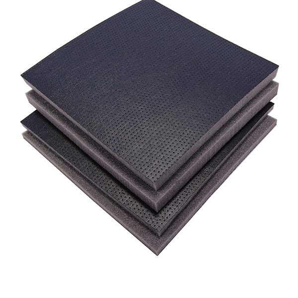 Acoustical foam with black perforated vinyl facing combines a highly absorbent polyester foam with an appealing upholstery facing. The vinyl is flame-retardant and cleanable. It remains tough and flexible over a broad temperature range, protecting the foam from impact and airborne particles.