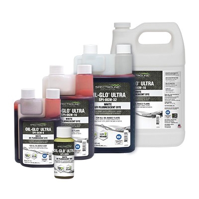 Spectroline® Oil-Glo® Ultra UV Fluorescent Leak Detection Dye, Container Size: 16 oz, Container Type: Bottle, Liquid, White, Light Blend Petroleum, Composition: Petroleum Hydrocarbon, Flash Point: 242.6 deg F, Viscosity: 2.7 cSt, For Use With: Hydraulic Systems, Pipelines, Turbines, Liquid Holding Tanks, Cooling Towers, Turbine Engines, Vacuum Systems, Natural Gas Lines, Pneumatic Systems, Propane Tanks, and Vacuum Systems