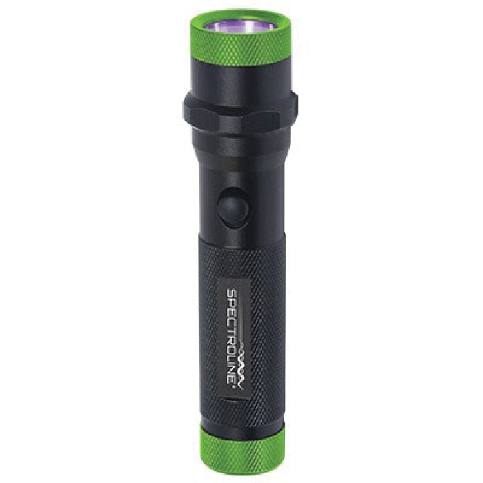 Spectroline® Violet Light Leak Detection Flashlight, Beam Distance: 25 ft, Battery Size: (3) AAA, Battery Life: 5 hr, Bulb Type: Violet Light LED, Battery Included: Yes, Dimensions: 1.25 in Dia x 5.9 in L