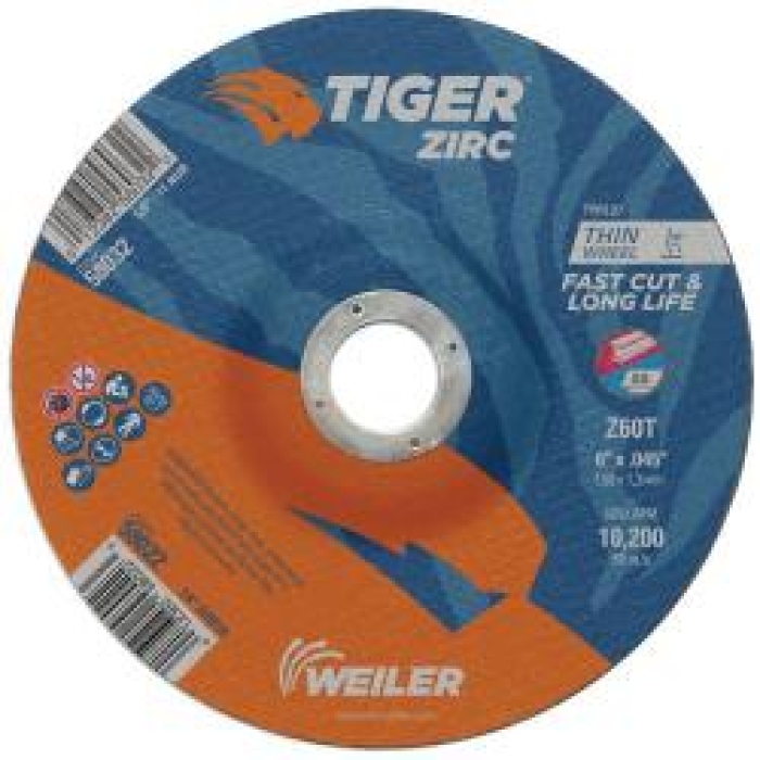 TIGER® Depressed Center Cutting Wheel, Type 27 Wheel, 6 in Diameter, 0.045 in Thickness, 7/8 in Arbor, 60 Grit, Fine Grit Grade, Zirconia Alumina Abrasive, 10200 rpm, Resin Bond, T Hardness, Applicable Materials: Iron, Stainless Steel, Steel, Structural Steel, Black