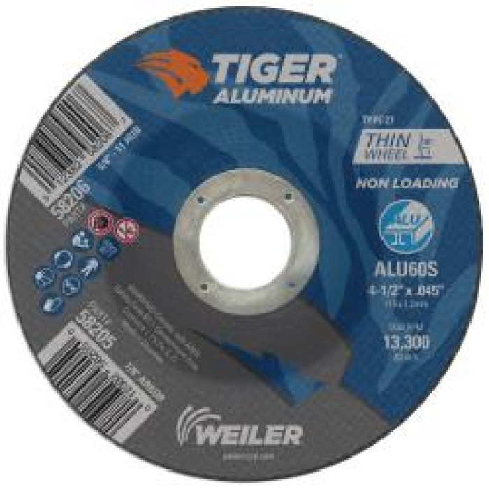 TIGER® aluminum 4-1/2 in type 27 depressed center cutting wheels are specifically designed for high performance cutting and extended wheel life on aluminum. These wheels blend abrasive grains with Weiler® non-loading formula, resulting in a fast and consistent cut rate on aluminum. The depressed center provides added clearance when working at a constrained angle. Wheel thickness of 0.045 in is ideal for cutting tubes, bar stock and large cross sections with a right angle grinder. The 7/8 in open arbor offers a cost effective mounting option when using adapting nuts.