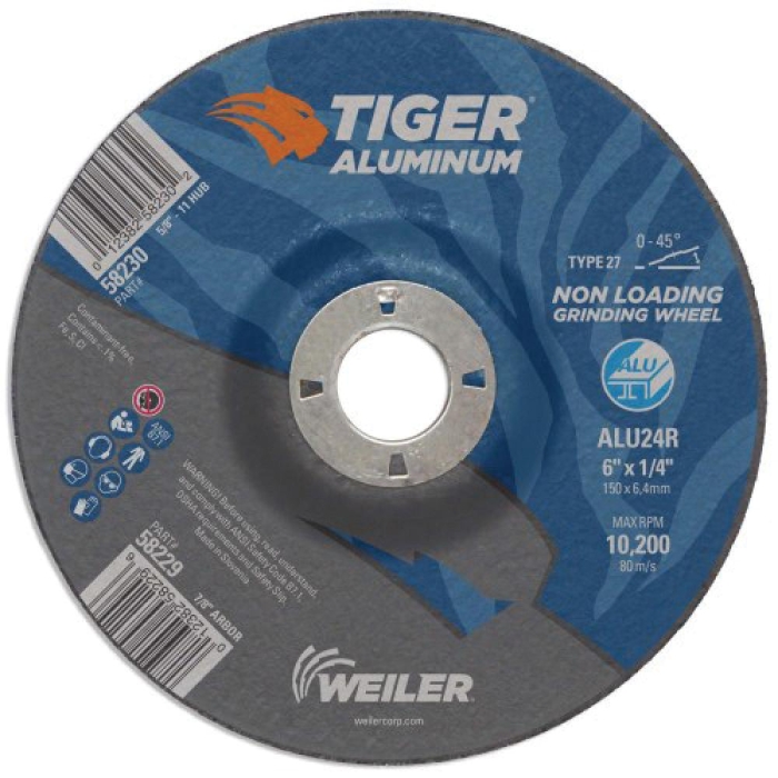 TIGER® aluminum 6 in type 27 grinding wheels are specifically designed for high performance grinding and extended wheel life on aluminum. These wheels blend abrasive grains with Weiler® non-loading formula, resulting in a fast and consistent cut rate on aluminum. The flat profile with depressed center allows for a wide range of grinding angles (0 to 45 deg) with a right angle grinder. Ideal for heavy stock removal, scale removal, weld removal, weld blending, edge beveling and torch-cut softening. The 7/8 in open arbor offers a cost effective mounting option when using adapting nuts.