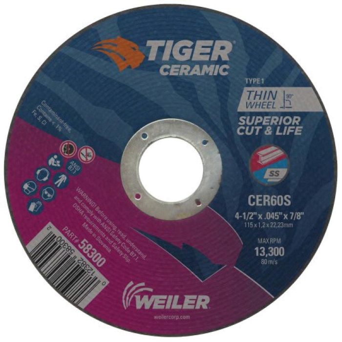 TIGER® Cut-Off Wheel, Type 1, Flat Wheel, 4-1/2 in Diameter, 0.045 in Thickness, 7/8 in Arbor, 60 Grit, Fine Grit Grade, Ceramic Abrasive, 13300 rpm, Resin Bond, S Hardness, Applicable Materials: Armored Steel, High Nickel Alloy, Inconel, Stainless Steel, Steel, Titanium, Tool Steel, Black