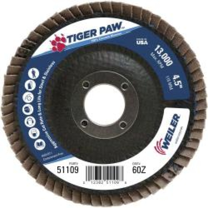 TIGER PAW™ 51109 Abrasive Flap Disc, Type 27, Flat Disc, 4-1/2 in Dia, 7/8 in Center Hole, 60 Grit, Medium Grit