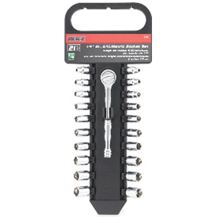 Includes | : | 6 Point SAE Sockets: 5/32, 7/32, 1/4, 9/32, 5/16, 11/32, 3/8, 7/16, 15/32, 1/2 in, 6 Point Metric Sockets: 4, 5, 6, 7, 8, 9, 10, 11, 12 and 13 mm, 5-1/2 in Quick Release 1/4 in Drive Ratchet |