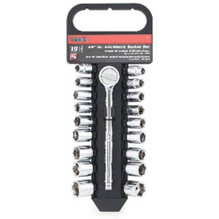 Titan® SAE/Metric Socket Set, Measuring System: SAE, Metric, 19 -Piece, Material Construction: Carbon Steel, Includes: 6 Point SAE Sockets: 3/8, 7/16, 15/32, 1/2, 9/16, 5/8, 11/16, 3/4 and 13/16 in, 6 Point Metric Sockets: 9, 10, 11, 12, 13, 14, 15, 17 and 19 mm, 7-3/4 in Quick Release 3/8 in Drive Ratchet