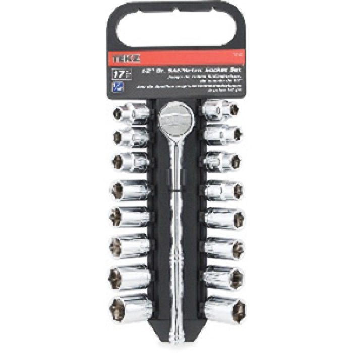 Includes | : | 6 Point SAE Sockets: 1/2 in Drive Sockets 3/8, 7/16, 1/2, 9/16, 5/8, 11/16, 3/4 and 13/16 in, 6 Point Metric Sockets: 10, 11, 12, 13, 14, 15, 17 and 19 mm, 9-3/4 in Quick Release 1/2 in Drive Ratchet |