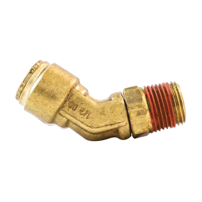 Tramec Sloan 45 deg Swivel Elbow, Series: S254PMT, Connection Type 1: Push-to-Connect, Connection Size 1: 3/8 in, Connection Type 2: NPT, Gender 2: Male, Connection Size 2: 1/8 in, 145 psi, Material Construction: Brass, -40 to 225 deg F, For Use With: SAE J844 Air Brake Tubing