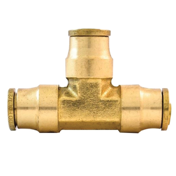 Tramec Sloan Union Tee, Series: S264PMT, Connection Type 1: Push-to-Connect, Connection Size 1: 3/4 in, Connection Type 2: Push-to-Connect, Connection Size 2: 3/4 in, Connection Type 3: Push-to-Connect, Connection Size 3: 3/4 in, 145 psi, Material Construction: Brass, -40 to 225 deg F, For Use With: SAE J844 Air Brake Tubing