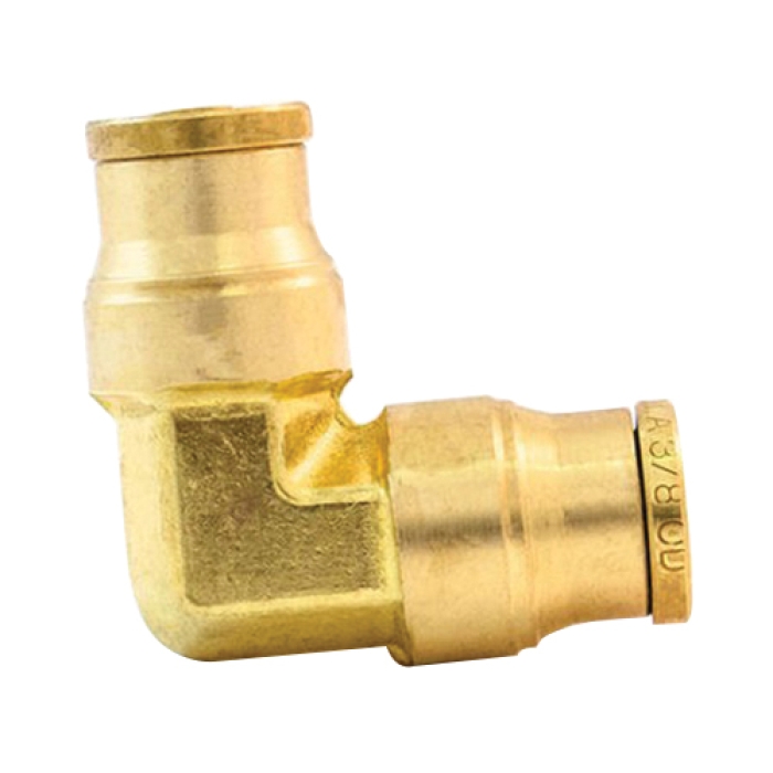 Tramec Sloan 90 deg Union Elbow, Series: S265PMT, Connection Type 1: Push-to-Connect, Connection Size 1: 3/8 in, Connection Type 2: Push-to-Connect, Connection Size 2: 3/8 in, 145 psi, Material Construction: Brass, -40 to 225 deg F, For Use With: SAE J844 Air Brake Tubing