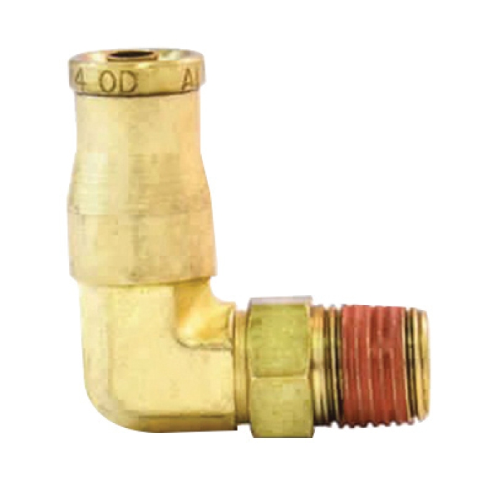 Tramec Sloan 90 deg Reducing Swivel Elbow, Series: S269PMT, Connection Type 1: Push-to-Connect, Connection Size 1: 1/4 in, Connection Type 2: NPT, Gender 2: Male, Connection Size 2: 3/8 in, 145 psi, Material Construction: Brass, -40 to 225 deg F, For Use With: SAE J844 Air Brake Tubing