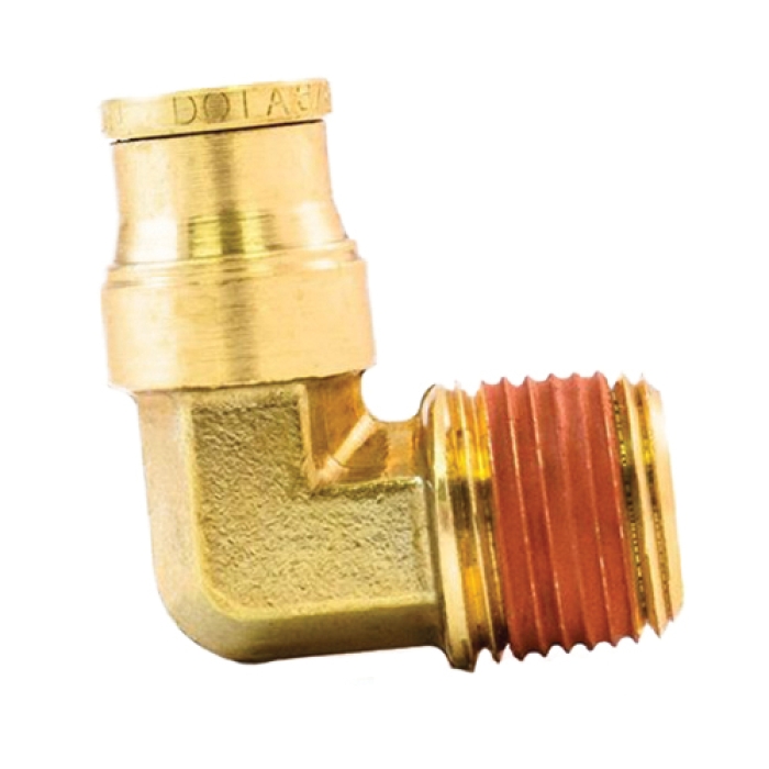 Tramec Sloan 90 deg Elbow, Series: S269PMTNS, Connection Type 1: Push-to-Connect, Connection Size 1: 1/4 in, Connection Type 2: NPT, Gender 2: Male, Connection Size 2: 1/4 in, 145 psi, Material Construction: Brass, -40 to 225 deg F, For Use With: SAE J844 Air Brake Tubing