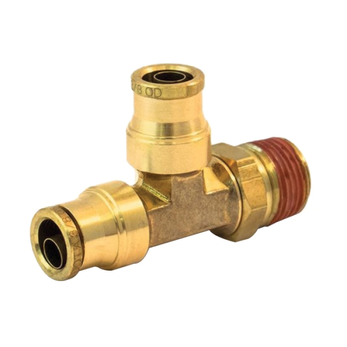 Tramec Sloan Swivel Run Tee, Series: S271PMT, Connection Type 1: Push-to-Connect, Connection Size 1: 3/8 in, Connection Type 2: Push-to-Connect, Connection Size 2: 3/8 in, Connection Type 3: NPT, Gender 3: Male, Connection Size 3: 3/8 in, 145 psi, Material Construction: Brass, -40 to 225 deg F, For Use With: SAE J844 Air Brake Tubing