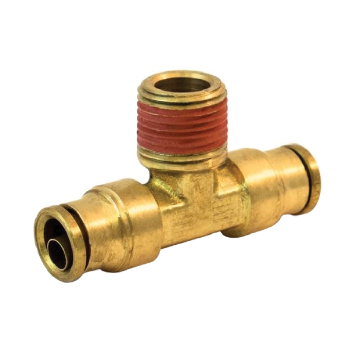 Tramec Sloan Branch Tee, Series: S272PMTNS, Connection Type 1: Push-to-Connect, Connection Size 1: 3/8 in, Connection Type 2: Push-to-Connect, Connection Size 2: 3/8 in, Connection Type 3: NPT, Gender 3: Male, Connection Size 3: 3/8 in, 145 psi, Material Construction: Brass, -40 to 225 deg F, For Use With: SAE J844 Air Brake Tubing