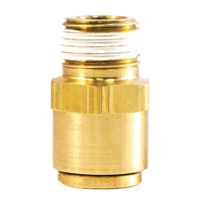 Tramec Sloan Connector, Series: S68PMT, Connection Type 1: Push-to-Connect, Connection Size 1: 3/8 in, Connection Type 2: NPT, Gender 2: Male, Connection Size 2: 3/8 in, 145 psi, Material Construction: Brass, -40 to 225 deg F, For Use With: SAE J844 Air Brake Tubing