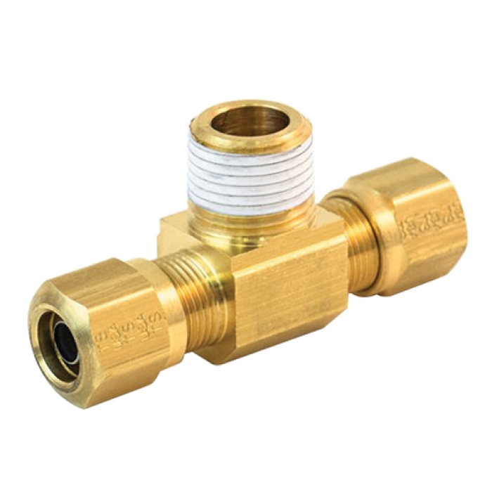 Tramec Sloan Compression Branch Tee, Series: S772AB, Connection Type 1: Tube, Connection Size 1: 1/2 in, Connection Type 2: Tube, Connection Size 2: 1/2 in, Connection Type 3: NPT, Gender 3: Male, Connection Size 3: 3/8 in, Up to 150 psi, Material Construction: Brass, -40 to 200 deg F
