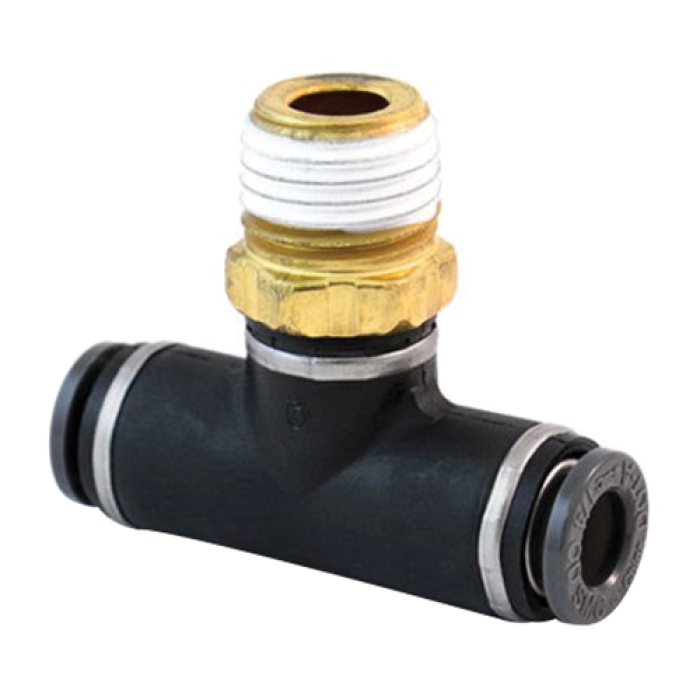 Tramec Sloan Repositionable Branch Tee, Series: S772PMT, Connection Type 1: Push-to-Connect, Connection Size 1: 1/8 in, Connection Type 2: Push-to-Connect, Connection Size 2: 1/8 in, Connection Type 3: NPT, Gender 3: Male, Connection Size 3: 1/4 in, 145 psi, Material Construction: Brass, -40 to 140 deg F, For Use With: SAE J844 Air Brake Tubing