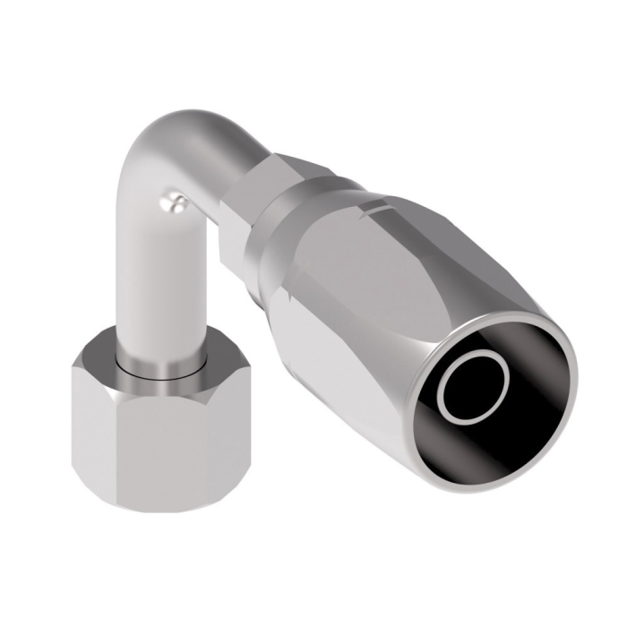 Weatherhead® Field Attachable Reusable Long Drop 90 deg Elbow, Series: 425 N, Connection Type 1: Hose, Gender 1: Female, Connection Size 1: 3/8 in, Hose Dash Size: 06, Connection Type 2: SAE 37 deg JIC Flare Swivel, Gender 2: Female, Connection Size 2: 3/8 in, Nominal Size: 3/8 in, Thread Size 2: 9/16-18, Hex Size: 15/16 x 11/16 in, Cut-Off Factor: 2 in, Material Construction: Carbon Steel, Finish: Dura-Kote, For Use With: H425 Series Hoses, Dimensions: 3.56 in L x 1.03 in W x 2.97 in H, Dimension Standards: SAE 100R2