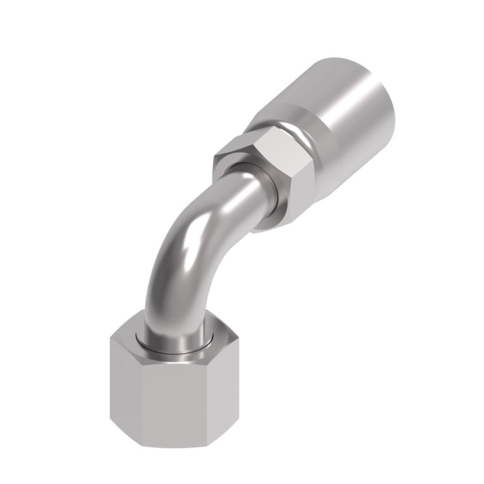 Weatherhead® Crimp Hose 90 deg Long Drop Elbow, Series: Coll-O-Crimp E, Connection Type 1: Hose, Connection Size 1: 3/8 in, Hose Dash Size: 06, Connection Type 2: ORFS Swivel, Gender 2: Female, Connection Size 2: 3/8 in, Nominal Size: 3/8 in, Thread Size 2: 11/16-16, Hex Size: 5/8 x 13/16 in, Cut-Off Factor: 1.88 in, Material Construction: Carbon Steel, Finish: Zinc Clear Trivalent Chromate, For Use With: H009, H209, H243, H265, H275, H277, H285, H435, H436, S-TW, and SC-TW Series PTFE Hoses, Dimensions: 3.22 in L x 0.81 in W x 2.91 in H