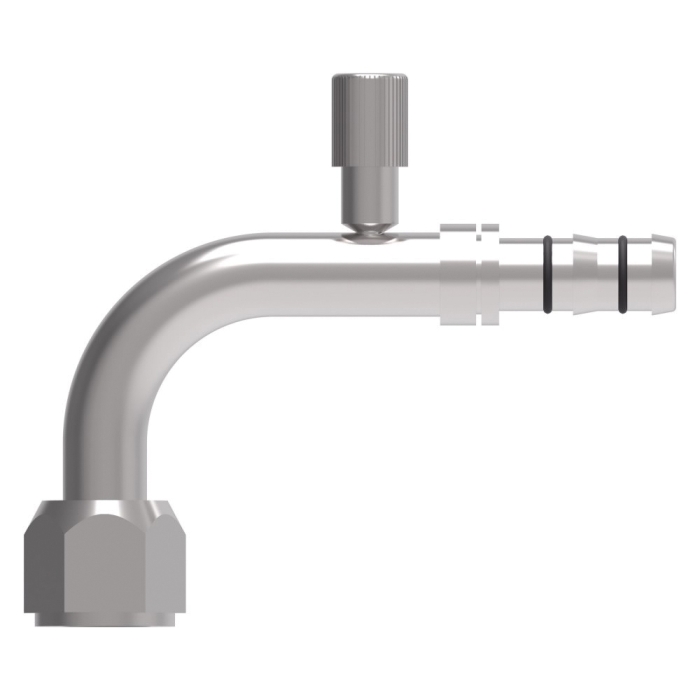 Weatherhead® E-Z Clip System™ 90 deg Elbow with R134a High Side Port, Series: FJ3013, Connection Type 1: Hose, Connection Size 1: 1/2 in, Hose Dash Size: 08, Connection Type 2: O-Ring Short Pilot, Gender 2: Female, Connection Size 2: 1/2 in, Thread Size 2: 3/4-16, Hex Size: 0.88 in, Material Construction: Carbon Steel, Finish: Zinc Clear Trivalent Chromate, For Use With: E-Z Clip System A/C Refrigeration GH134 Hose, Dimensions: 5.05 in L x 0.88 in W x 2.38 in H