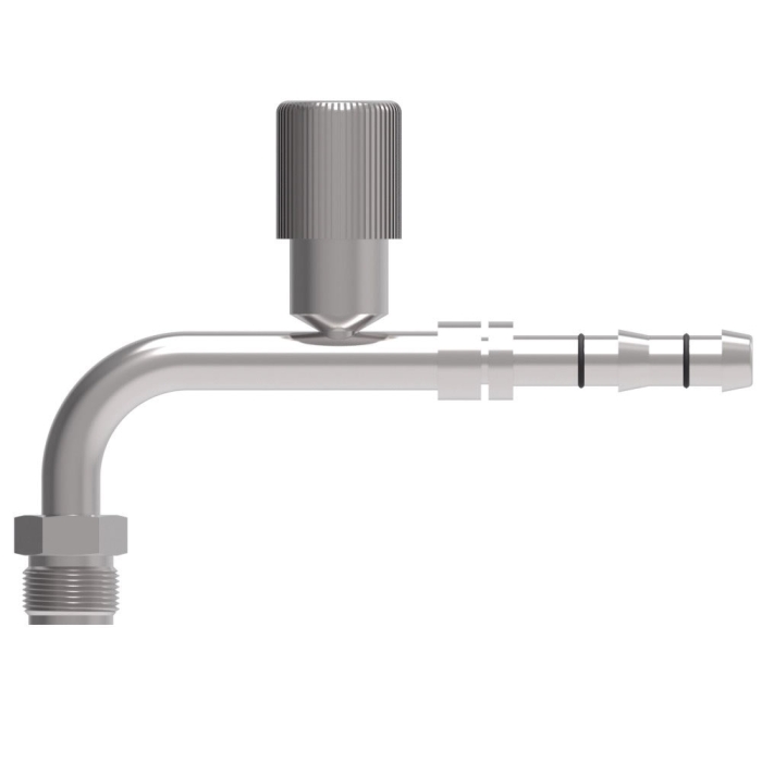 Weatherhead® E-Z Clip System™ 90 deg Elbow with R134a High Side Port, Series: FJ3134, Connection Type 1: Hose, Connection Size 1: 1/2 in, Hose Dash Size: 08, Connection Type 2: O-Ring Short Pilot, Gender 2: Male, Connection Size 2: 1/2 in, Thread Size 2: 3/4-18, Hex Size: 3/4 in, Material Construction: Carbon Steel, Finish: Zinc Clear Trivalent Chromate, For Use With: E-Z Clip System A/C Refrigeration GH134 Hose, Dimensions: 4.98 in L x 0.75 in W x 2.7 in H