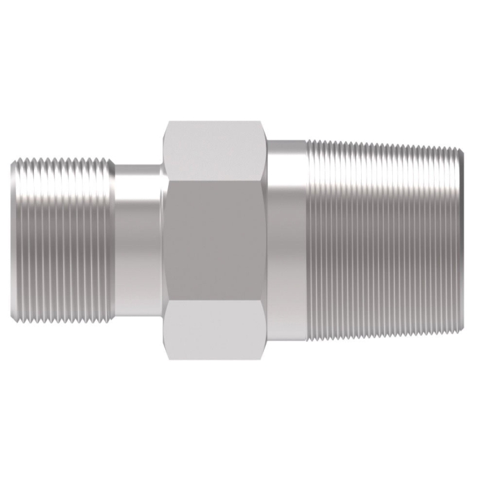 Weatherhead® Ermeto® Straight Connector, Series: 7205x, Connection Type 1: Flareless Tube, Gender 1: Male, Connection Size 1: 3/8 in, Connection Type 2: NPTF, Gender 2: Male, Connection Size 2: 1/4 in, Thread Size 2: 1/4-18, Hex Size: 5/8 in, Material Construction: Carbon Steel, Finish: Dura-Kote, Dimensions: 1.59 in L x 0.687 in W x 0.75 in H, Dimension Standards: SAE 080102