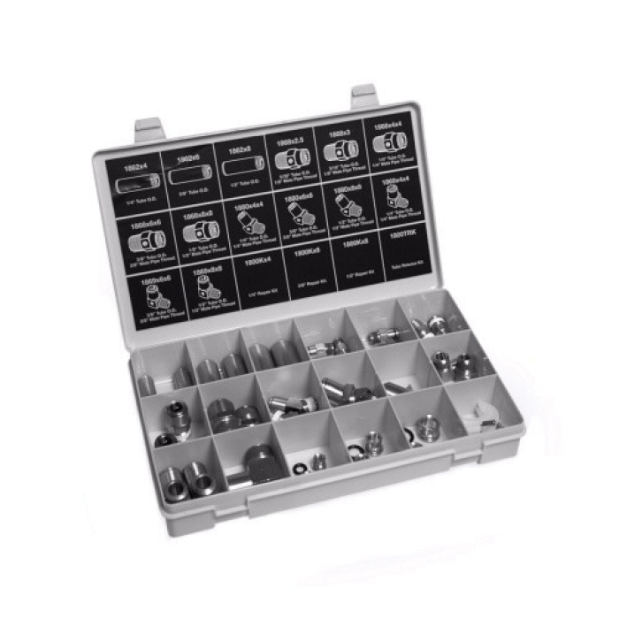The QC180 contains tube unions, male connectors, swivel male 45 deg elbow, male 90 deg elbows and repair kits in popular 1/4 in, 3/8 in and 1/2 in tube sizes designed for DOT truck and trailer air brake system needs.