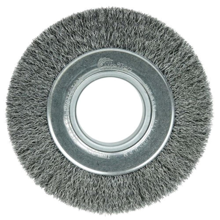 WEILER® Wheel Brush, 6 in Brush Diameter, 2 in Arbor, 1-1/8 in Trim Length, 1 in Face Width, 0.012 in Bristle Diameter, Crimped Bristle, Steel Bristle, 6000 rpm Maximum Speed, Applicable Materials: Armored Steel, Cast Iron, Ductile Iron, Steel, Tool Steel, Unthreaded Arbor Hole Mounting, Performance Tier: Performance
