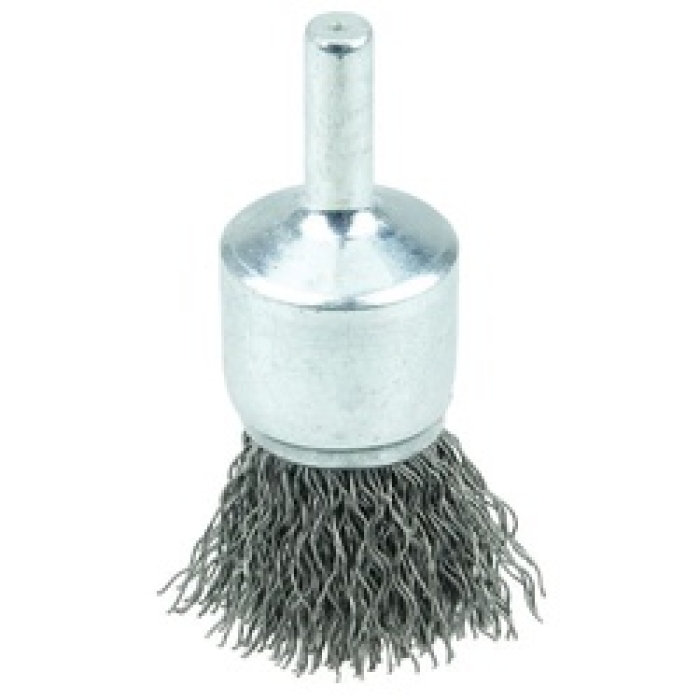 WEILER® End Brush, 3/4 in Brush Diameter, 7/8 in Trim Length, Stainless Steel Bristle, 0.02 in Bristle Diameter, Crimped Bristle, 22000 rpm Maximum Speed, 1/4 in Dia x 3/4 in L Shank, 2-9/16 in Overall Length, Applicable Materials: Steel, Stem Mounting, Silver