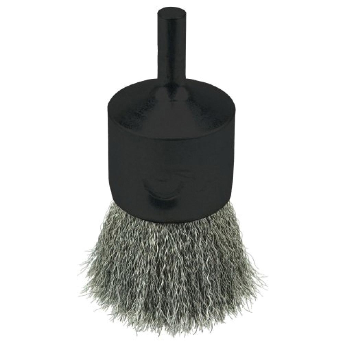 WEILER® End Brush, 1 in Brush Diameter, 1 in Trim Length, Stainless Steel Bristle, 0.01 in Bristle Diameter, Crimped Bristle, 22000 rpm Maximum Speed, 1/4 in Dia x 3/4 in L Shank, 2-3/16 in Overall Length, Applicable Materials: Aluminum, Brass, Bronze, Copper, High Nickel Alloy, Inconel, Pewter, Platinum, Stainless Steel, Titanium, Stem Mounting, Performance Tier: Performance, Gray