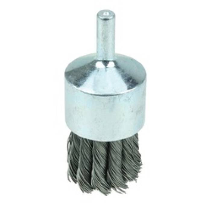 WEILER® End Brush, 1-1/8 in Brush Diameter, 7/8 in Trim Length, Steel Bristle, 0.014 in Bristle Diameter, Knotted Bristle, 22000 rpm Maximum Speed, 1/4 in Dia x 3/4 in L Shank, 2-5/8 in Overall Length, Applicable Materials: Armored Steel, Cast Iron, Ductile Iron, Steel, Tool Steel, Stem Mounting, Performance Tier: Performance, Black/Gray