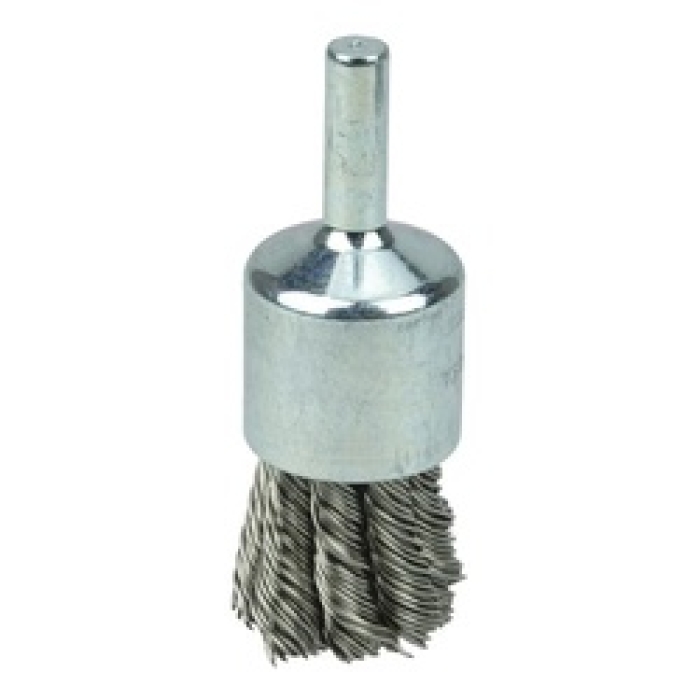 WEILER® End Brush, 3/4 in Brush Diameter, 7/8 in Trim Length, Stainless Steel Bristle, 0.02 in Bristle Diameter, Knotted Bristle, 25000 rpm Maximum Speed, 1/4 in Dia x 3/4 in L Shank, 2-5/8 in Overall Length, Applicable Materials: Aluminum, Brass, Bronze, Copper, High Nickel Alloy, Inconel, Pewter, Platinum, Stainless Steel, Titanium, Stem Mounting, Performance Tier: Performance, Silver