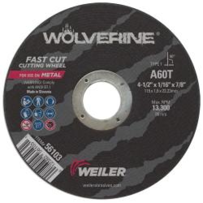 Weiler® Wolverine™ 4-1/2 in type 1 cutting wheels deliver a fast cut rate and consistent performance at a good value when cutting steel and other metals. The flat type 1 profile allows for deep cuts commonly required when cutting metal. The 1/16 in wheel thickness is ideal for cutting tubes, bar stock and large cross sections with a right angle grinder. The 7/8 in open arbor offers a cost effective mounting option when using adapting nuts. Wolverine™ is an aggressive, get it done product line for everyday general purpose use.