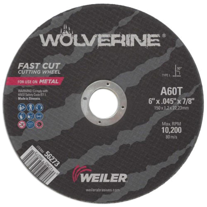 WOLVERINE® Cut-Off Wheel, Type 1, Flat Wheel, 6 in Diameter, 0.045 in Thickness, 7/8 in Arbor, 60 Grit, Fine Grit Grade, Aluminum Oxide Abrasive, 10200 rpm, Resin Bond, T Hardness, Applicable Materials: Carbon Steel, Iron, Metal, Steel, Black