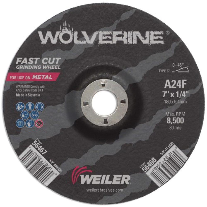 Weiler® Wolverine™ 7 in type 27 depressed center grinding wheels deliver a fast cut rate and consistent performance at a good value when grinding steel and other metals. The flat profile of the wheel in combination with depressed center allows for a wide range of grinding angles (0 to 45 deg). These 1/4 in grinding wheels are ideal for heavy stock removal, scale removal, weld removal, weld blending, edge beveling and torch-cut softening with a right angle grinder. The open arbor offers a cost effective mounting option when using adapting nuts. Wolverine™ is an aggressive, get it done product line for everyday general purpose use.