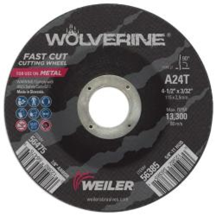 Weiler® Wolverine™ 4-1/2 in type 27 depressed center cutting wheels deliver a fast cut rate and consistent performance at a good value when cutting steel and other metals. The depressed center provides added clearance when working at a constrained angle and 3/32 in THK is ideal for cutting angle irons and large cross sections with a right angle grinder. The 7/8 in open arbor offers a cost effective mounting option when using adapting nuts. Wolverine™ is an aggressive, get it done product line for everyday general purpose use.